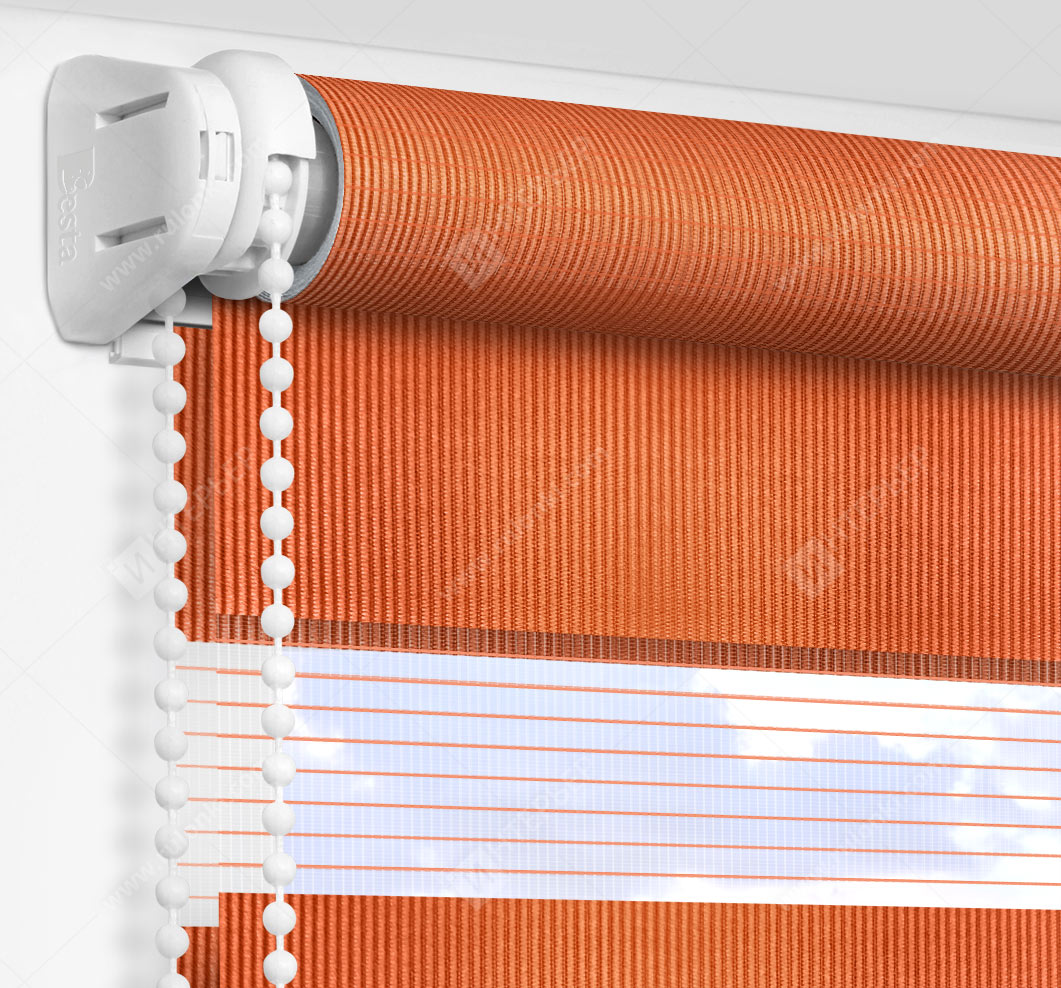 Рулонные шторы Зебра работают следующим образом: полоски ткани смещаются так, чтобы совпали светлые или темные слои, образуя, плотное или более прозрачное полотно. Так обеспечивается ночной или дневной режим затемнения. Также можно поднять шторное полотно полностью, открывая окно. По умолчанию - цвет фурнитуры белый.