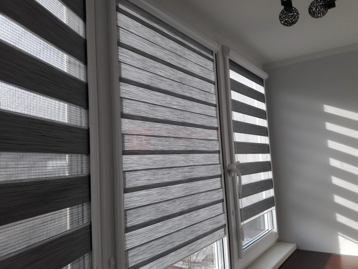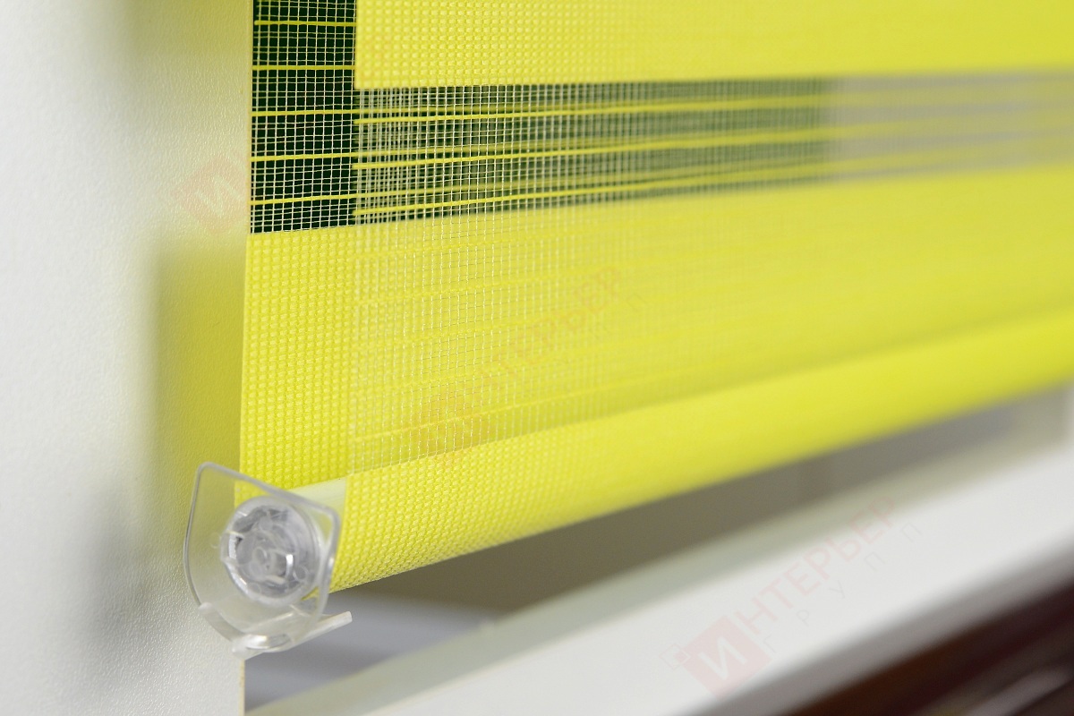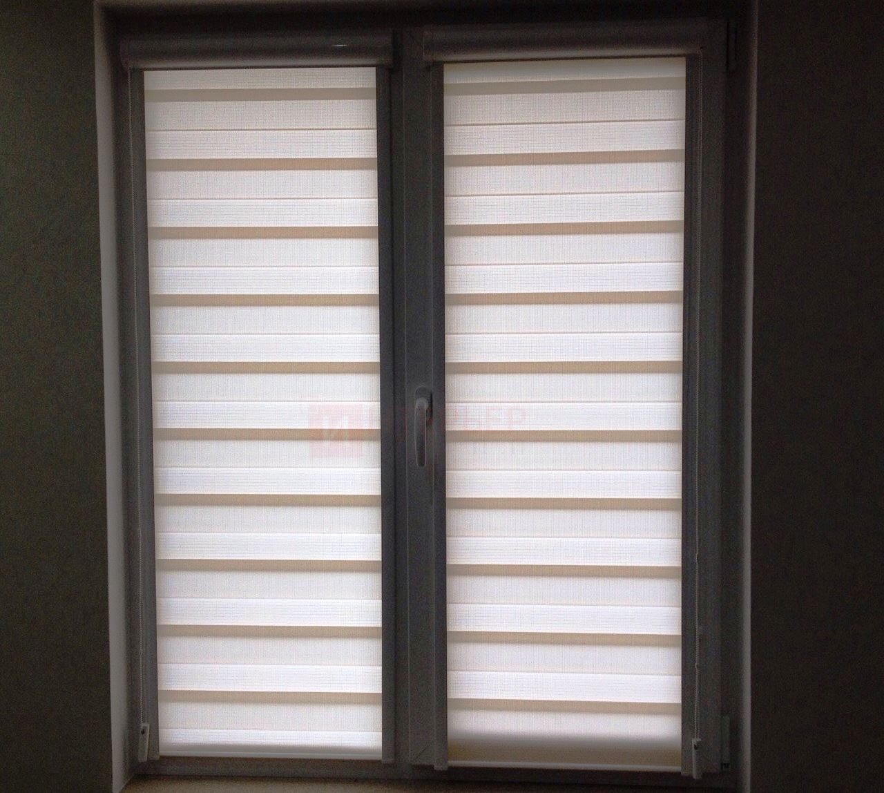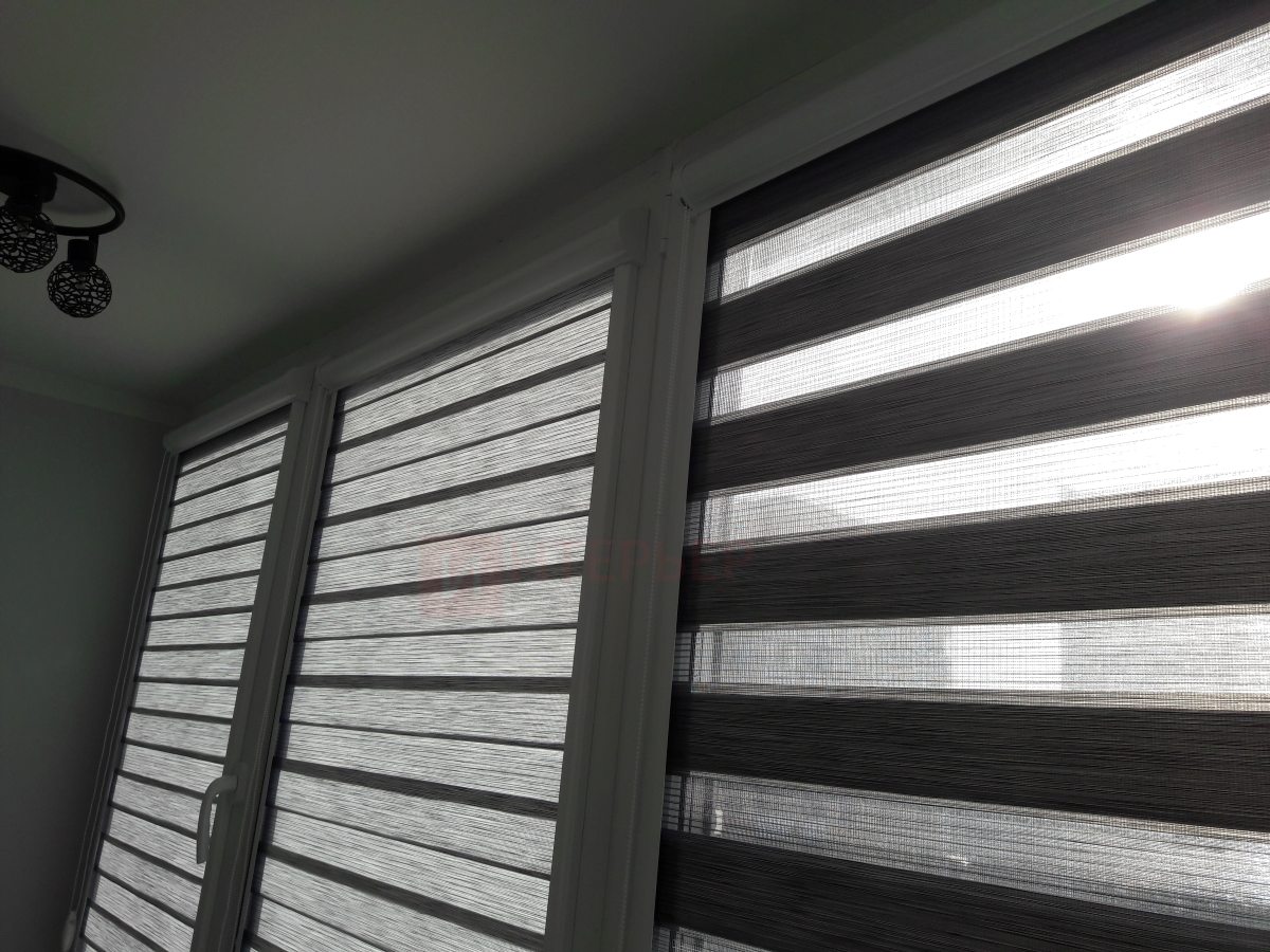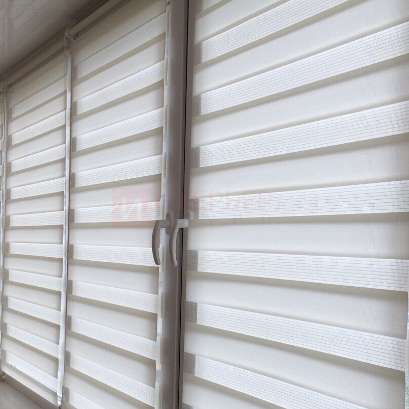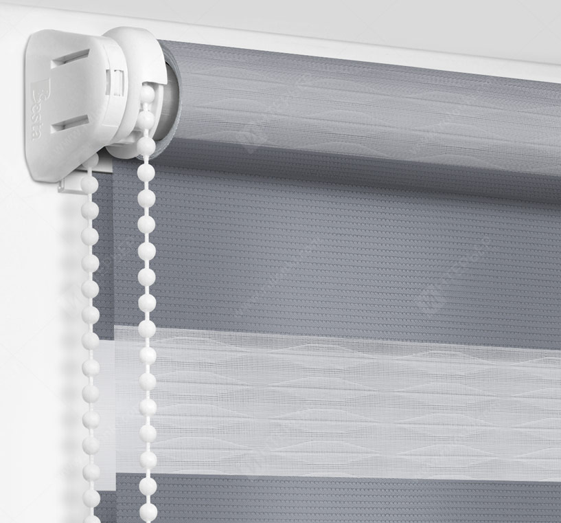Рулонные шторы Зебра работают следующим образом: полоски ткани смещаются так, чтобы совпали светлые или темные слои, образуя, плотное или более прозрачное полотно. Так обеспечивается ночной или дневной режим затемнения. Также можно поднять шторное полотно полностью, открывая окно. По умолчанию - цвет фурнитуры белый.