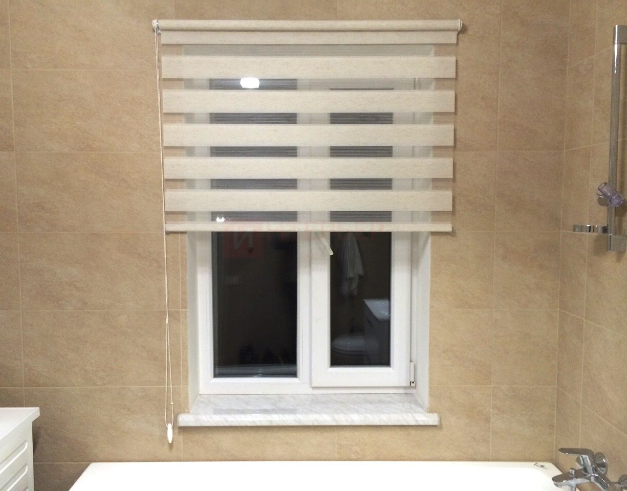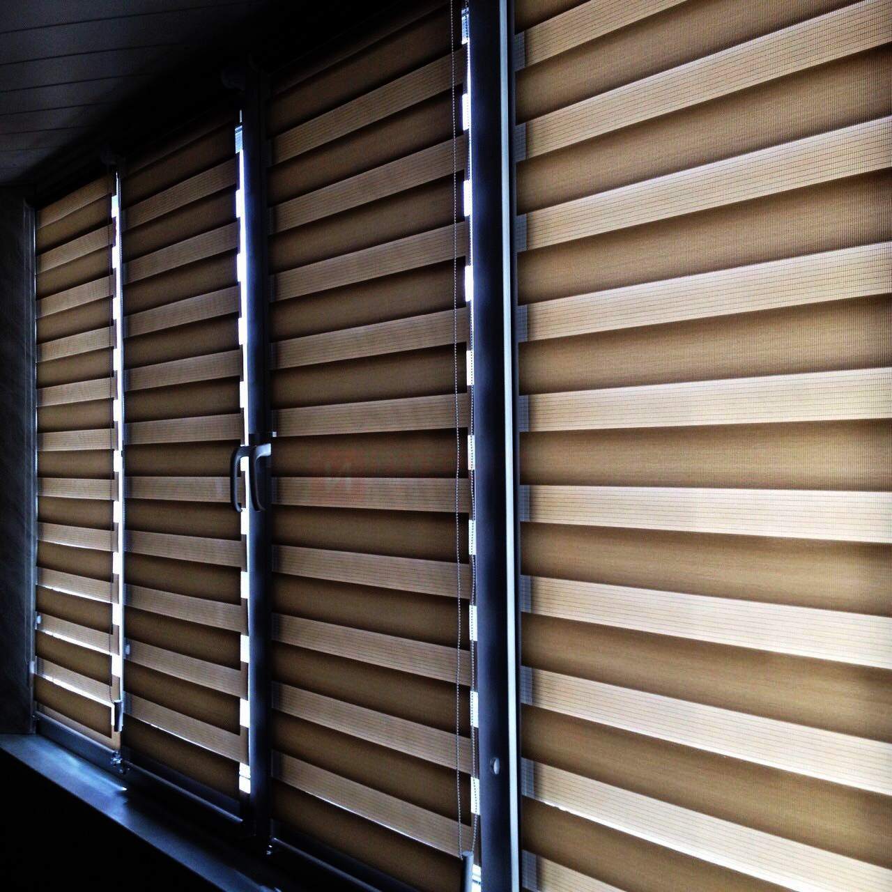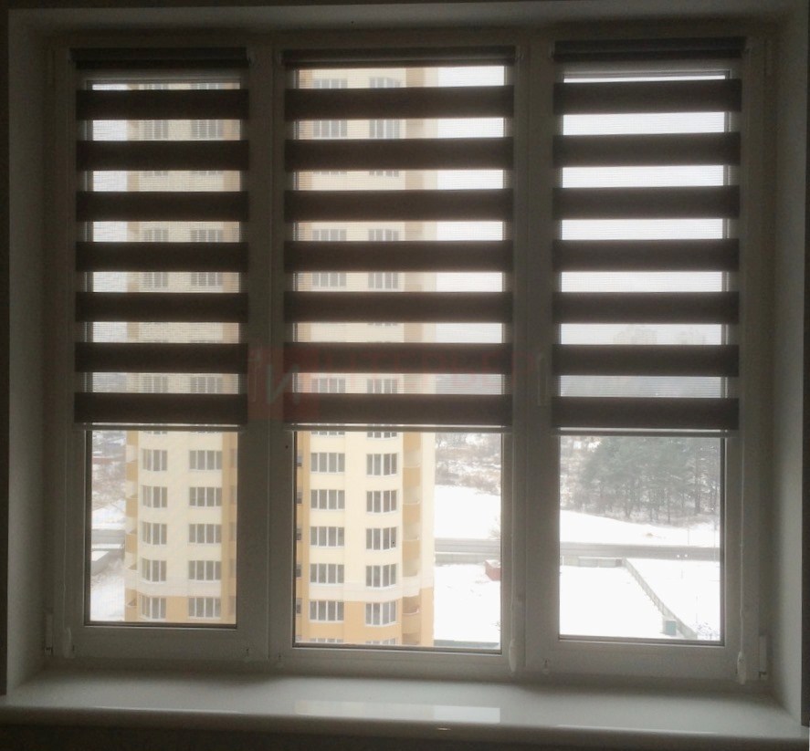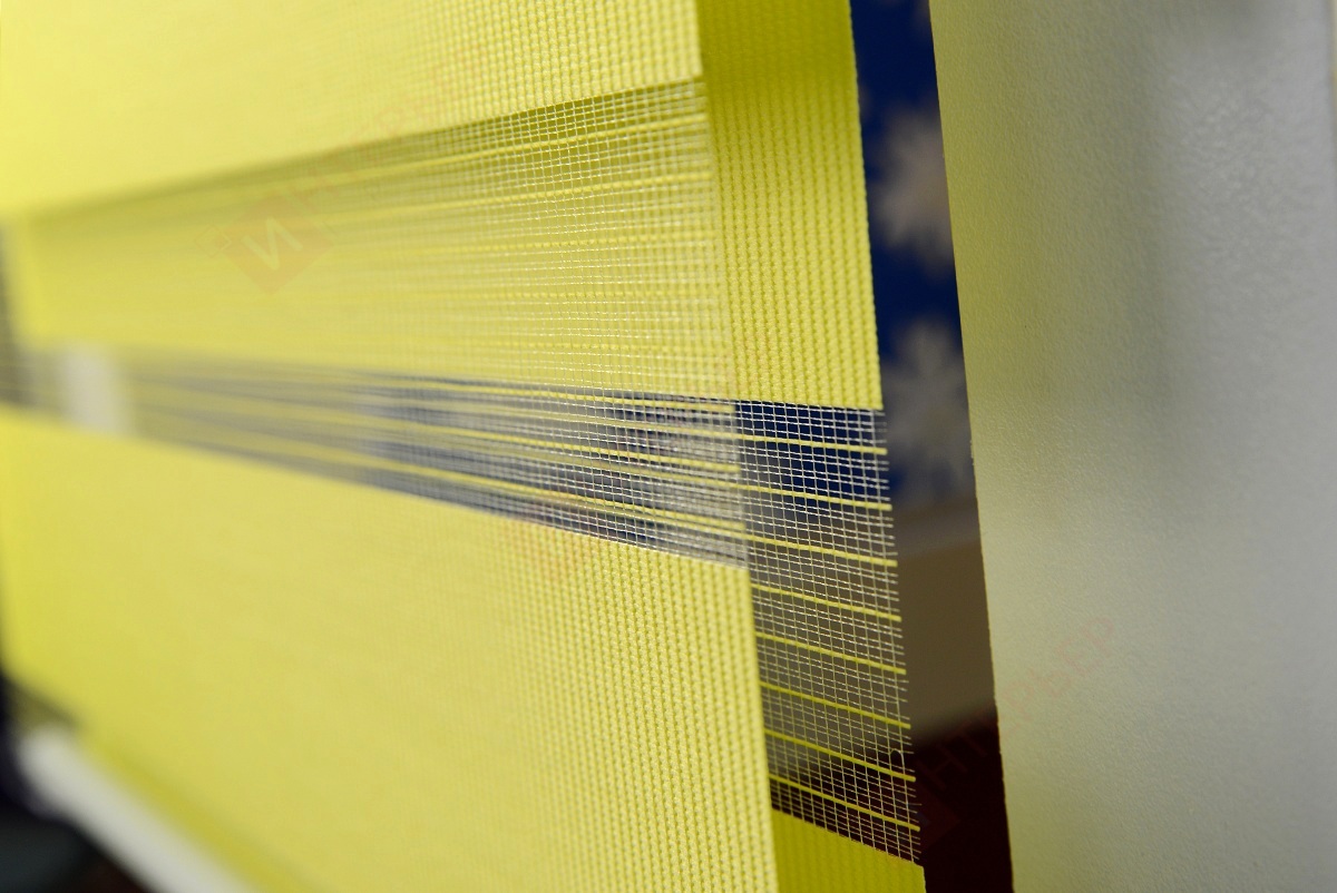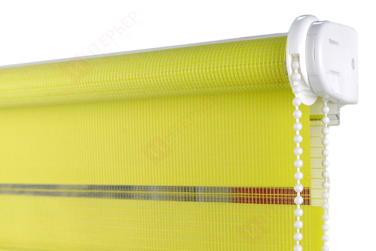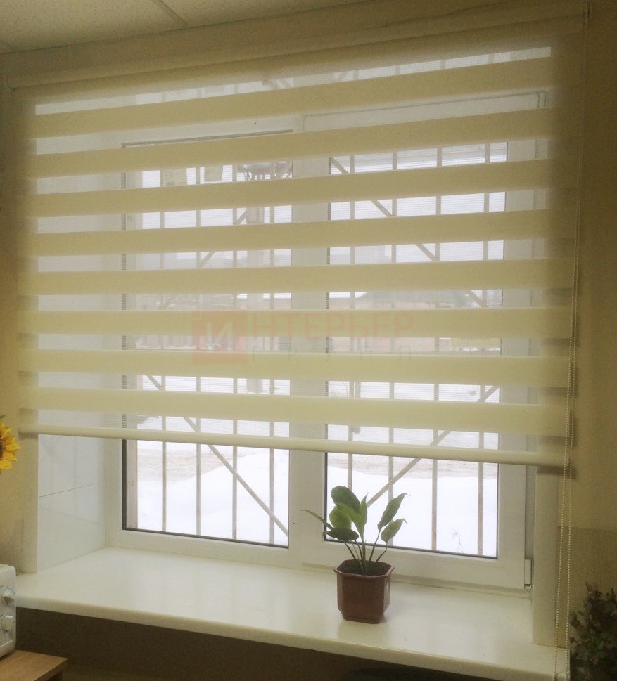 Рулонные шторы Зебра работают следующим образом: полоски ткани смещаются так, чтобы совпали светлые или темные слои, образуя, плотное или более прозрачное полотно. Так обеспечивается ночной или дневной режим затемнения. Также можно поднять шторное полотно полностью, открывая окно. По умолчанию - цвет фурнитуры белый.