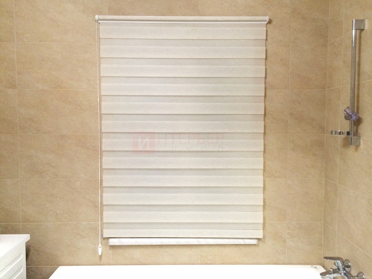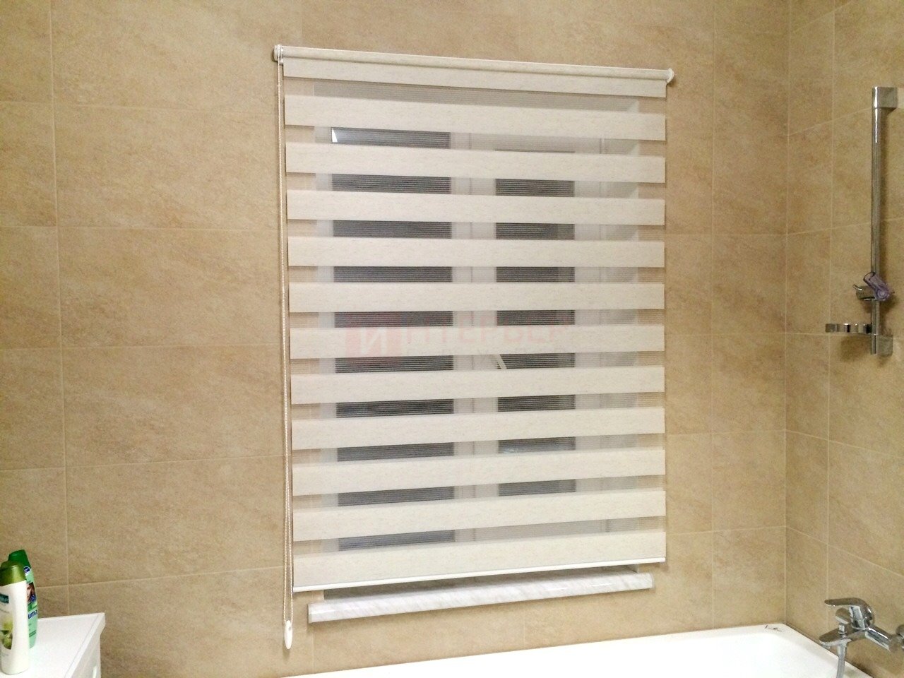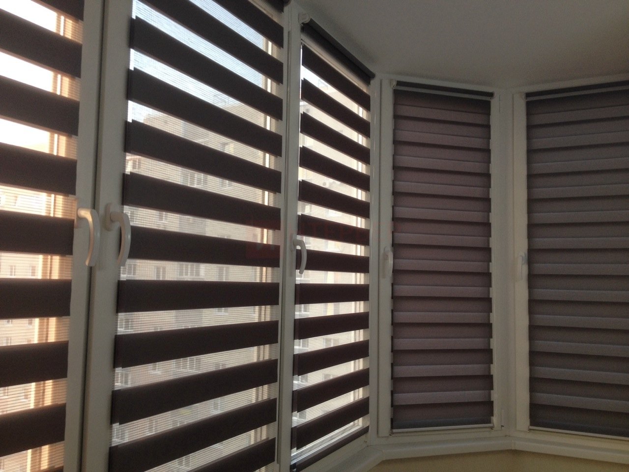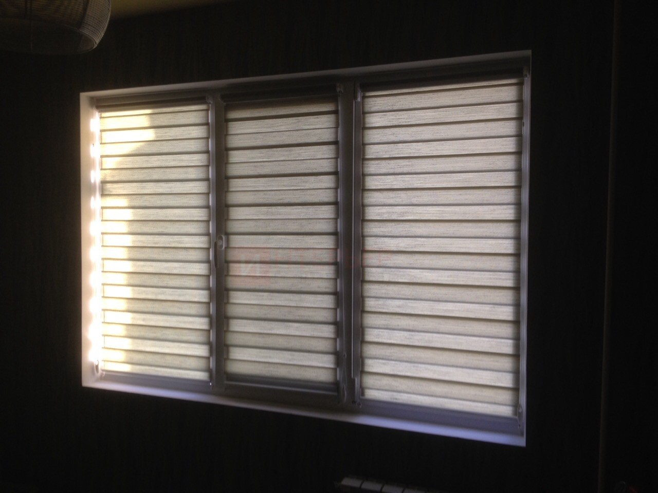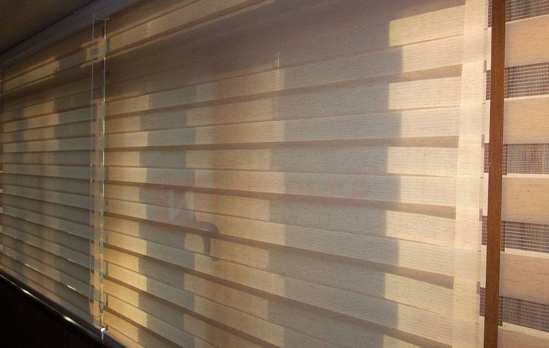 Рулонные шторы Зебра работают следующим образом: полоски ткани смещаются так, чтобы совпали светлые или темные слои, образуя, плотное или более прозрачное полотно. Так обеспечивается ночной или дневной режим затемнения. Также можно поднять шторное полотно полностью, открывая окно. По умолчанию - цвет фурнитуры белый.