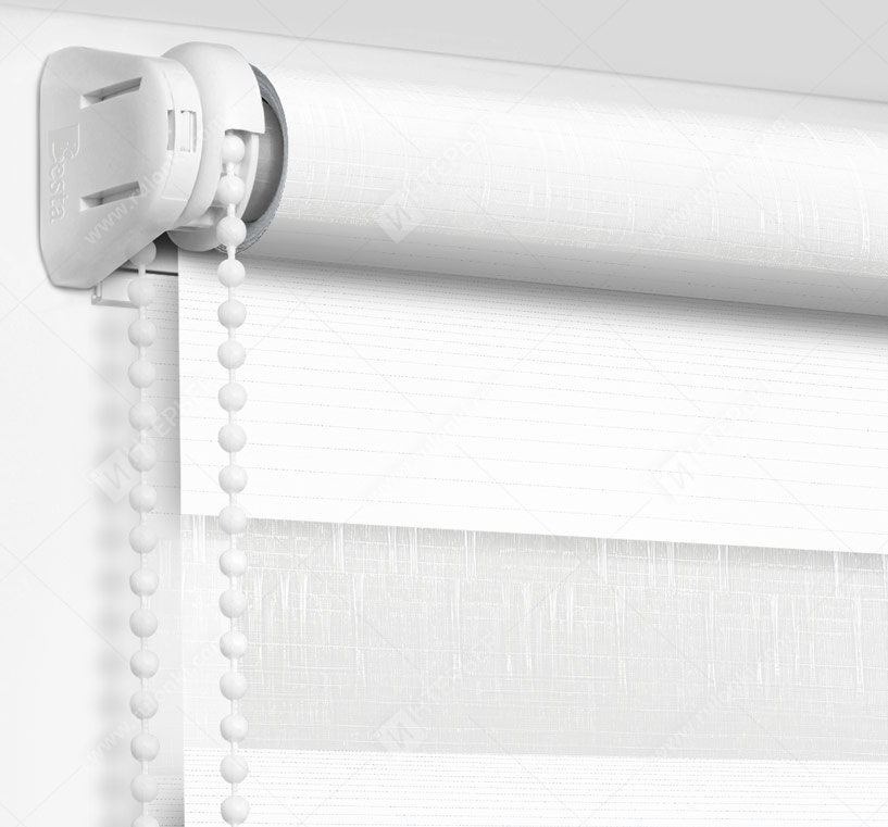 Рулонные шторы Зебра работают следующим образом: полоски ткани смещаются так, чтобы совпали светлые или темные слои, образуя, плотное или более прозрачное полотно. Так обеспечивается ночной или дневной режим затемнения. Также можно поднять шторное полотно полностью, открывая окно. По умолчанию - цвет фурнитуры белый.