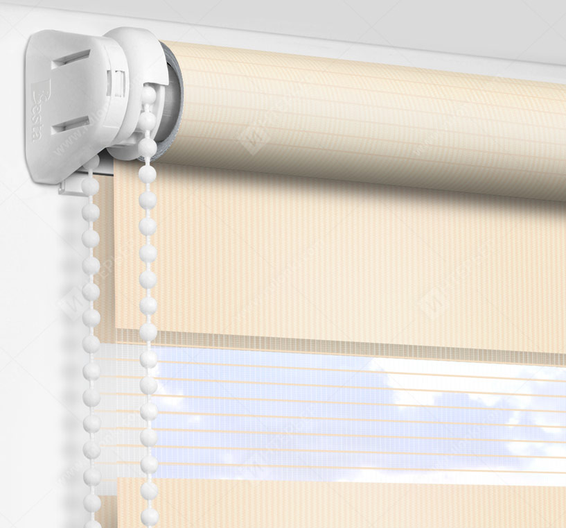 Рулонные шторы Зебра работают следующим образом: полоски ткани смещаются так, чтобы совпали светлые или темные слои, образуя, плотное или более прозрачное полотно. Так обеспечивается ночной или дневной режим затемнения. Также можно поднять шторное полотно полностью, открывая окно. По умолчанию - цвет фурнитуры белый.