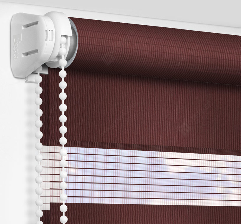 Рулонные шторы Зебра работают следующим образом: полоски ткани смещаются так, чтобы совпали светлые или темные слои, образуя, плотное или более прозрачное полотно. Так обеспечивается ночной или дневной режим затемнения. Также можно поднять шторное полотно полностью, открывая окно. По умолчанию - цвет фурнитуры белый.