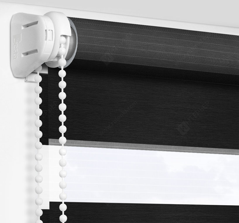 Рулонные шторы Зебра работают следующим образом: полоски ткани смещаются так, чтобы совпали светлые или темные слои, образуя, плотное или более прозрачное полотно. Так обеспечивается ночной или дневной режим затемнения. Также можно поднять шторное полотно полностью, открывая окно. По умолчанию - цвет фурнитуры белый.