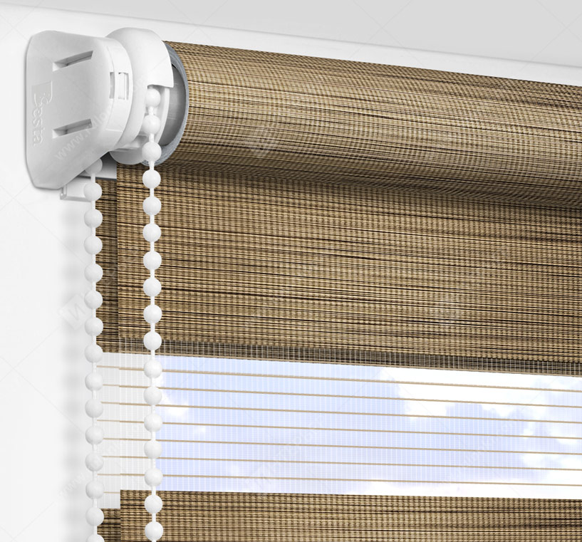 Задерживает от 30 до 80% света. Цвет: темно-бежевый (RAL 7008). Ширина полос: ткань 7.5 см, сетка 5 см.