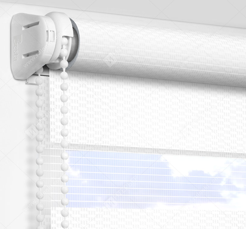Рулонные шторы Зебра работают следующим образом: полоски ткани смещаются так, чтобы совпали светлые или темные слои, образуя, плотное или более прозрачное полотно. Так обеспечивается ночной или дневной режим затемнения. Также можно поднять шторное полотно полностью, открывая окно. По умолчанию - цвет фурнитуры белый.