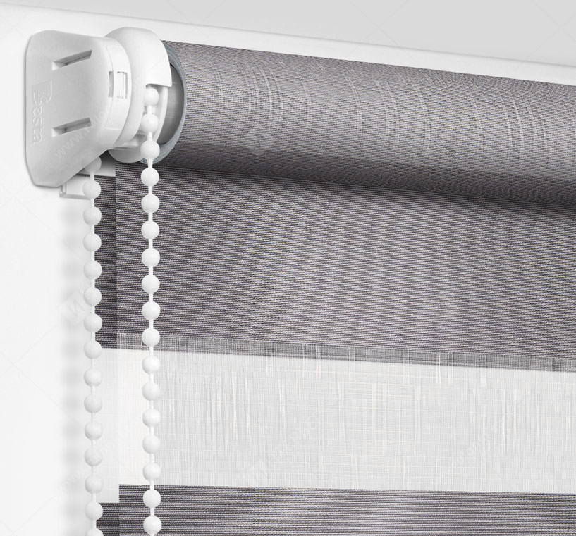 Рулонные шторы Зебра работают следующим образом: полоски ткани смещаются так, чтобы совпали светлые или темные слои, образуя, плотное или более прозрачное полотно. Так обеспечивается ночной или дневной режим затемнения. Также можно поднять шторное полотно полностью, открывая окно. По умолчанию - цвет фурнитуры белый.