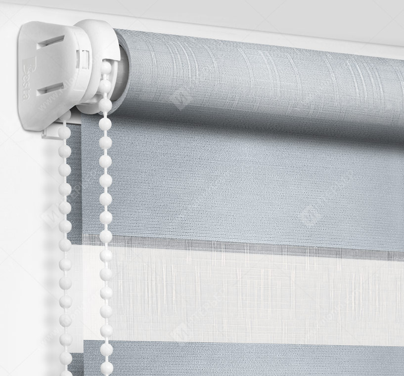 Рулонные шторы Зебра работают следующим образом: полоски ткани смещаются так, чтобы совпали светлые или темные слои, образуя, плотное или более прозрачное полотно. Так обеспечивается ночной или дневной режим затемнения. Также можно поднять шторное полотно полностью, открывая окно. По умолчанию - цвет фурнитуры белый.